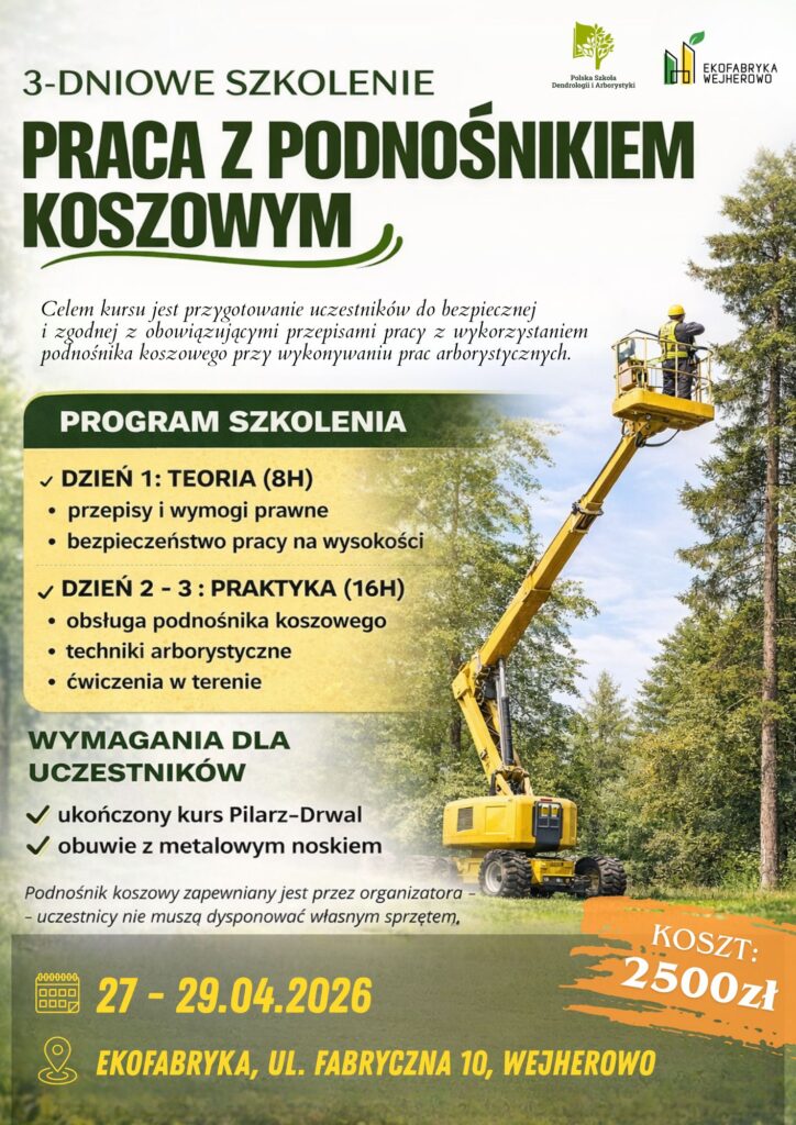 Polska Szkoła Dendrologii i Arborystyki prowadzi szkolenia z arborystyki praktycznej – wspinania na drzewa oraz wykonywania prac w koronach drzew z wykorzystaniem technik linowych.