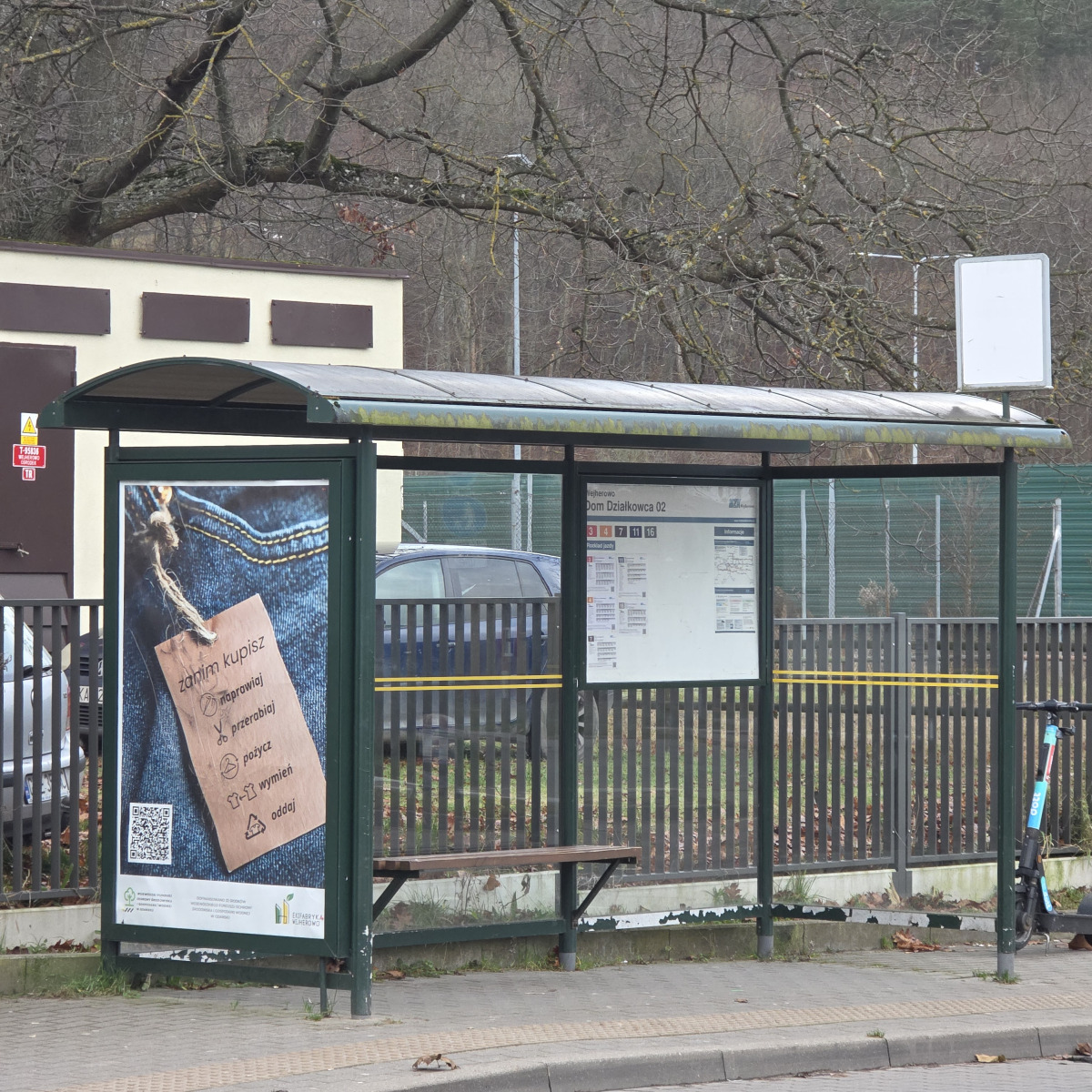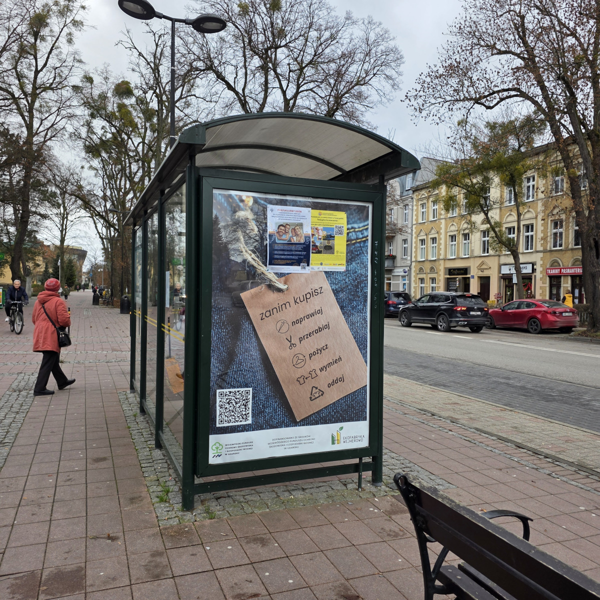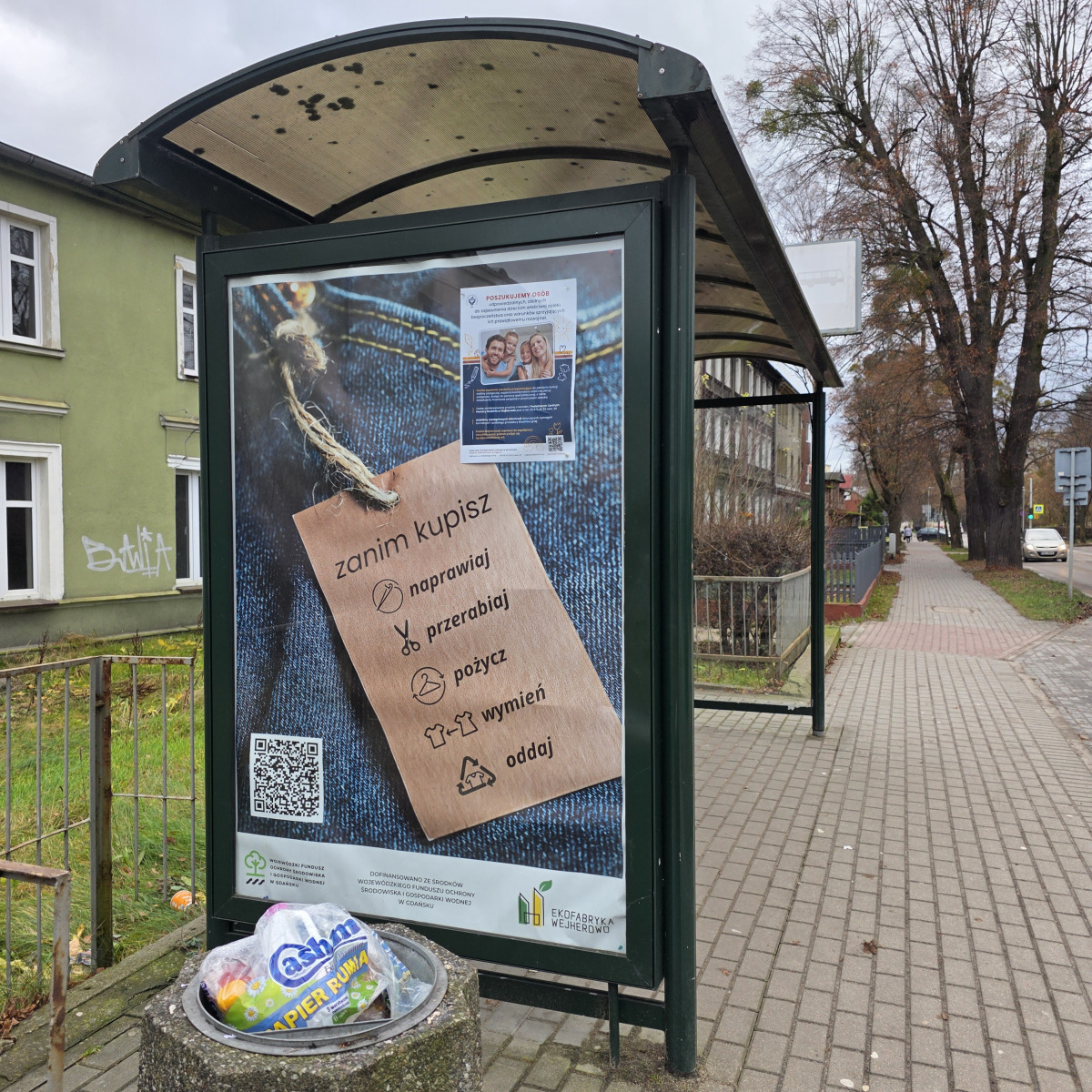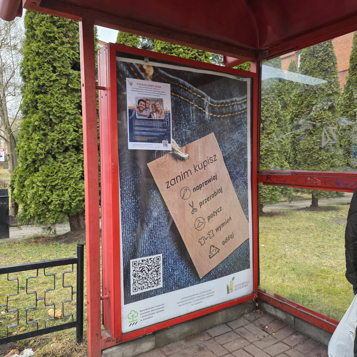 Plakaty na przystankach autobusowych przedstawiające sposoby zagospodarowania odpadów tekstylnych i ponownego użycia odzieży. Opracowanie tablic dydaktycznych dotyczących rodzajów materiałów, które przedstawią informację w usystematyzowany, graficzny sposób.